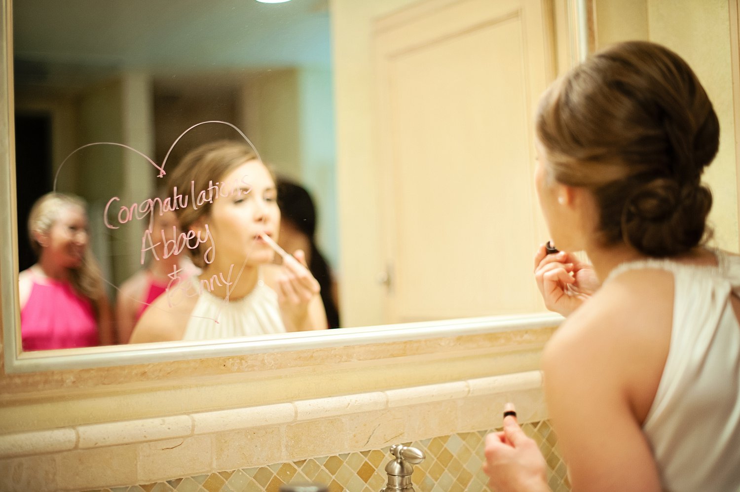 I’m obsessed with that shot of her in the mirror with the “Congratulations” heart written in lipstick in the foreground. Gorgeous gallery!