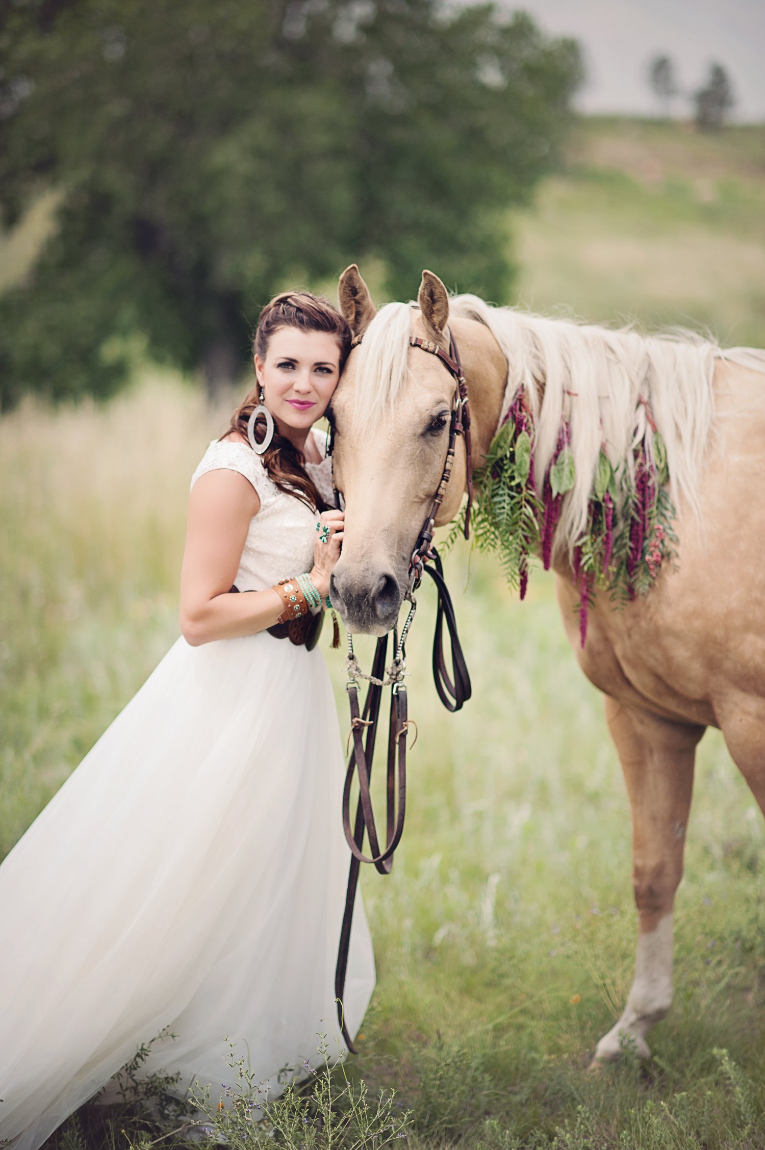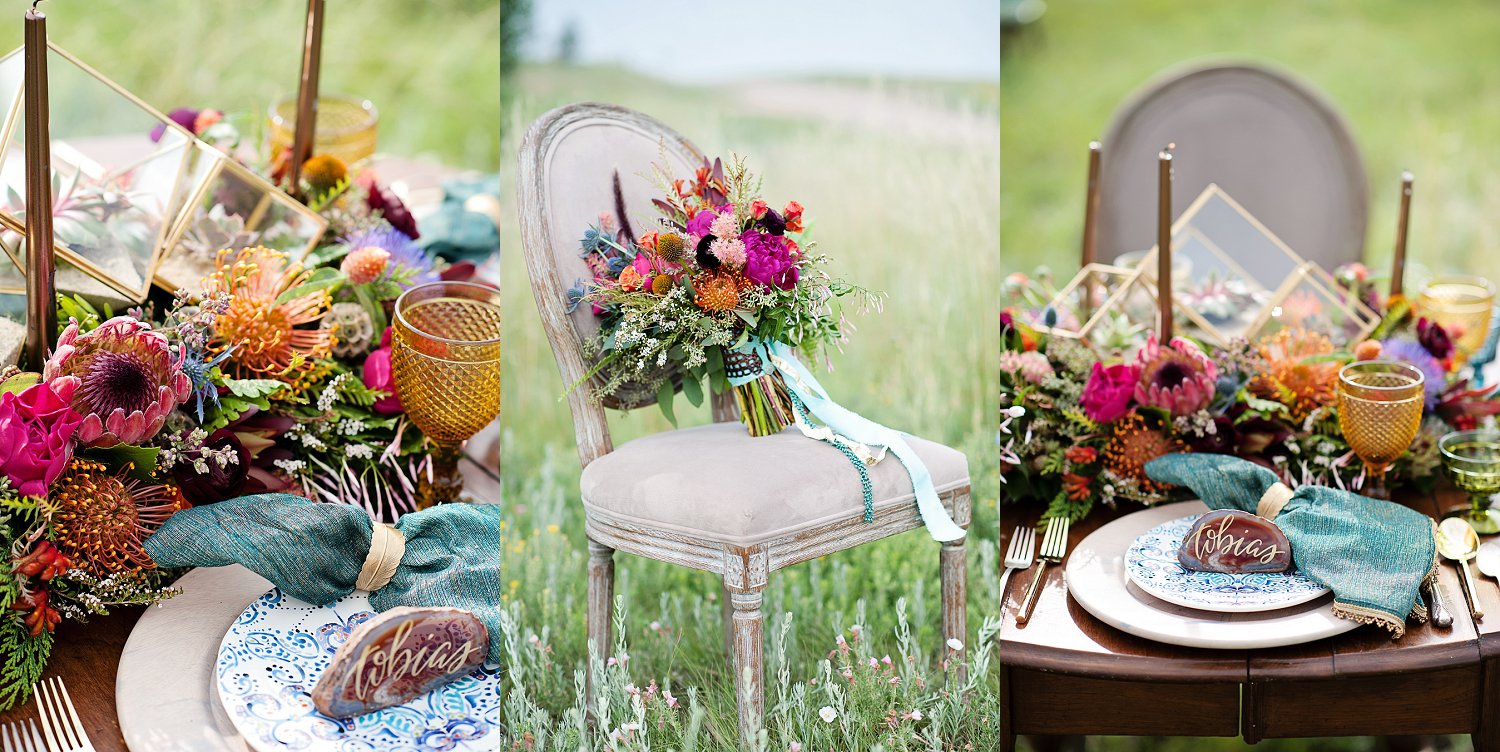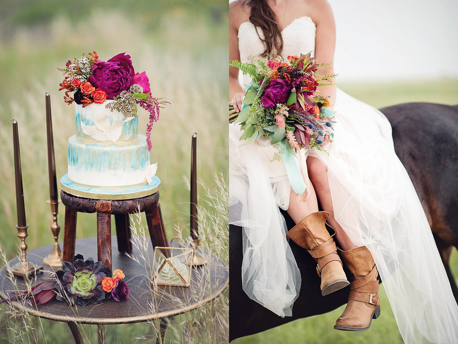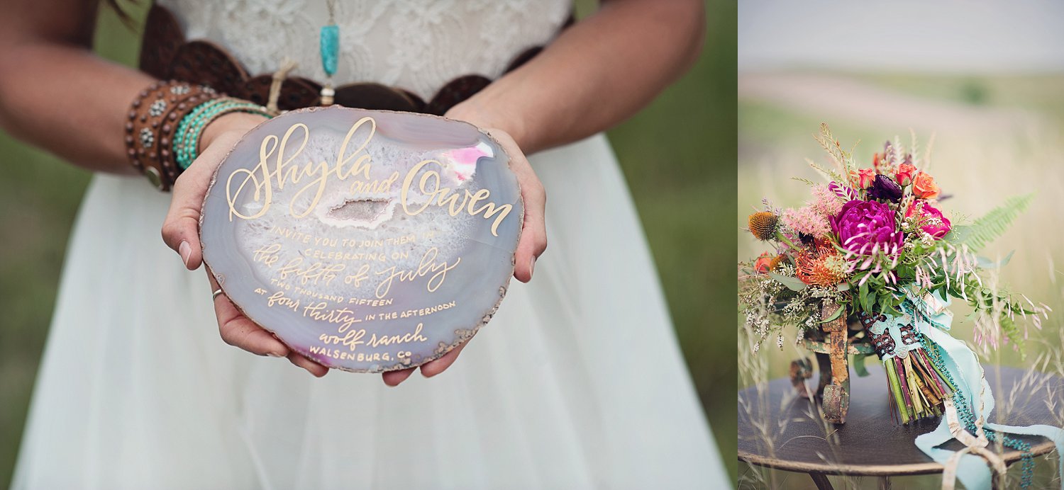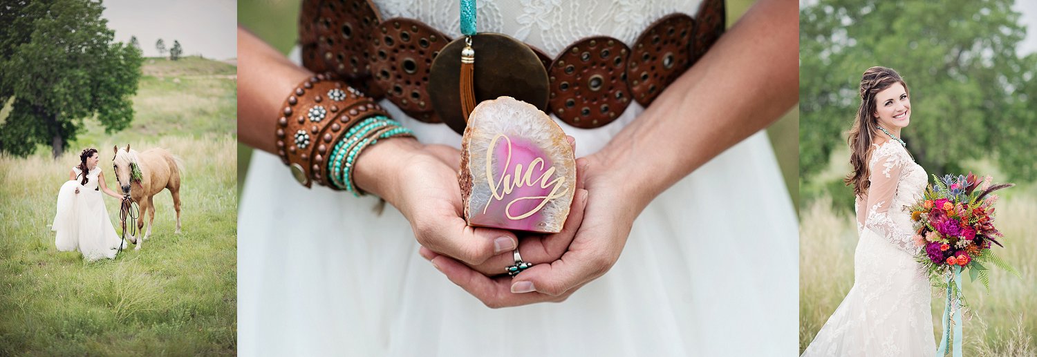 So from there, my super talented friend over at Sunflower Creative, helped with SO much of the table design, details and some of the boho (jewelery, boots, belts etc).  We spent a ton of time planning, dreaming and having FUN.  I think its easy in this industry to just keep working…photographing the beautiful weddings is SO amazing but sometimes a girl just has to get out there and shoot, style, create for her self.  And that is what we did!  From the amazing talent on the stones for calligraphy, to the feather detail on the cake and the gold and turquoise coloring…and not only that but I need to  mention the intricate braids  Beauty on Location by Liz worked on with April and the horse…yes, little braids on the horse.  Such beautiful work!