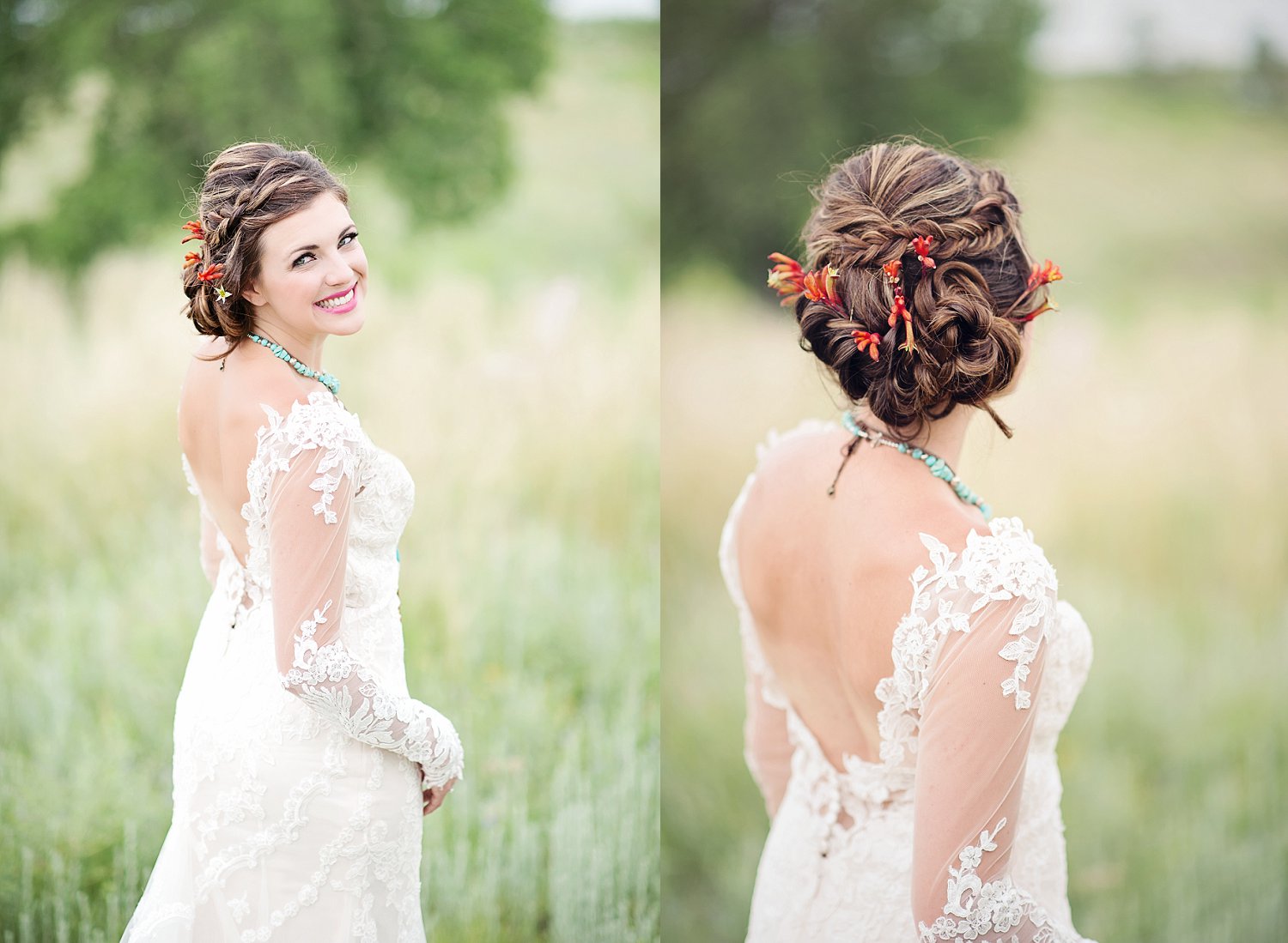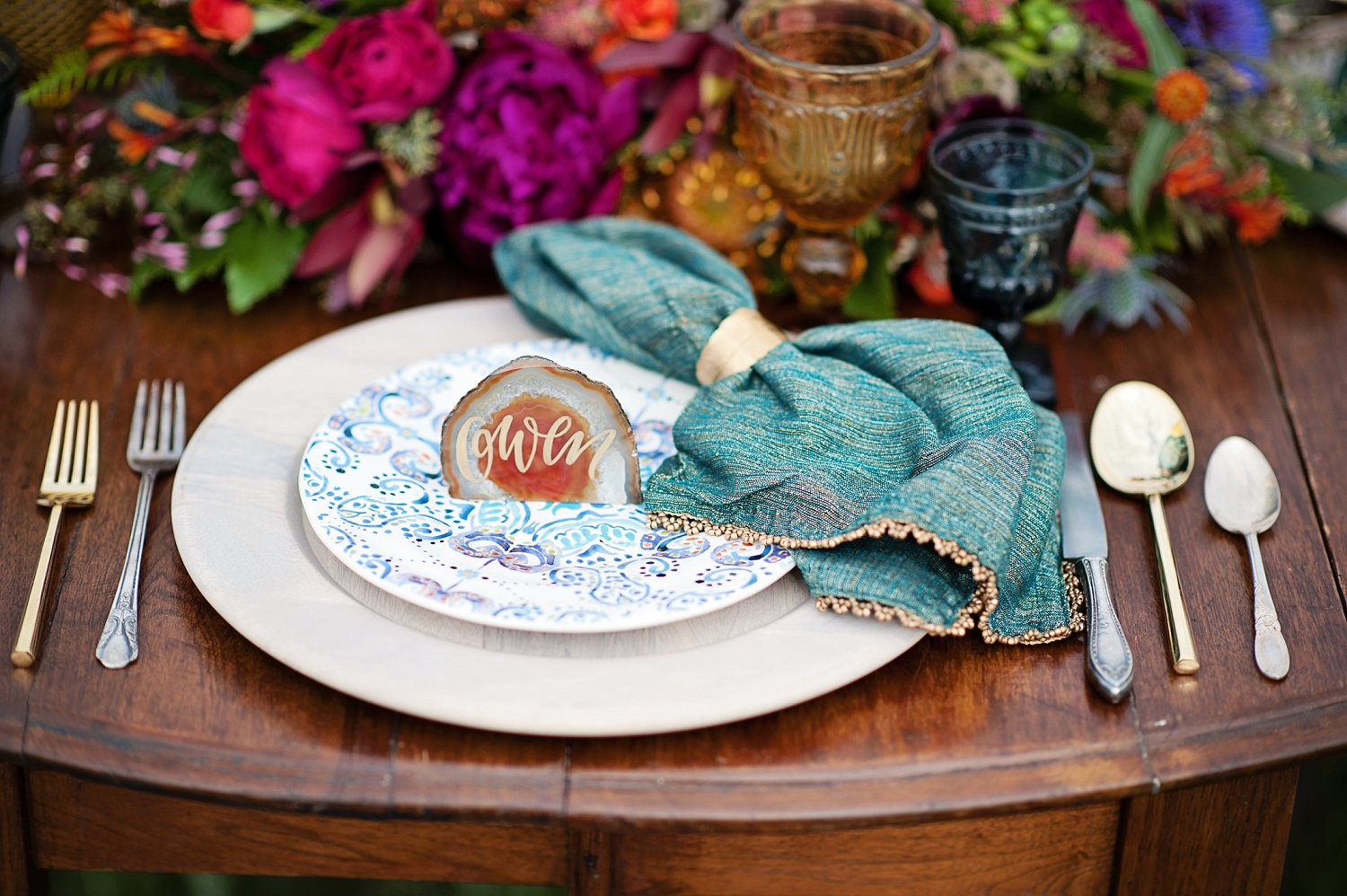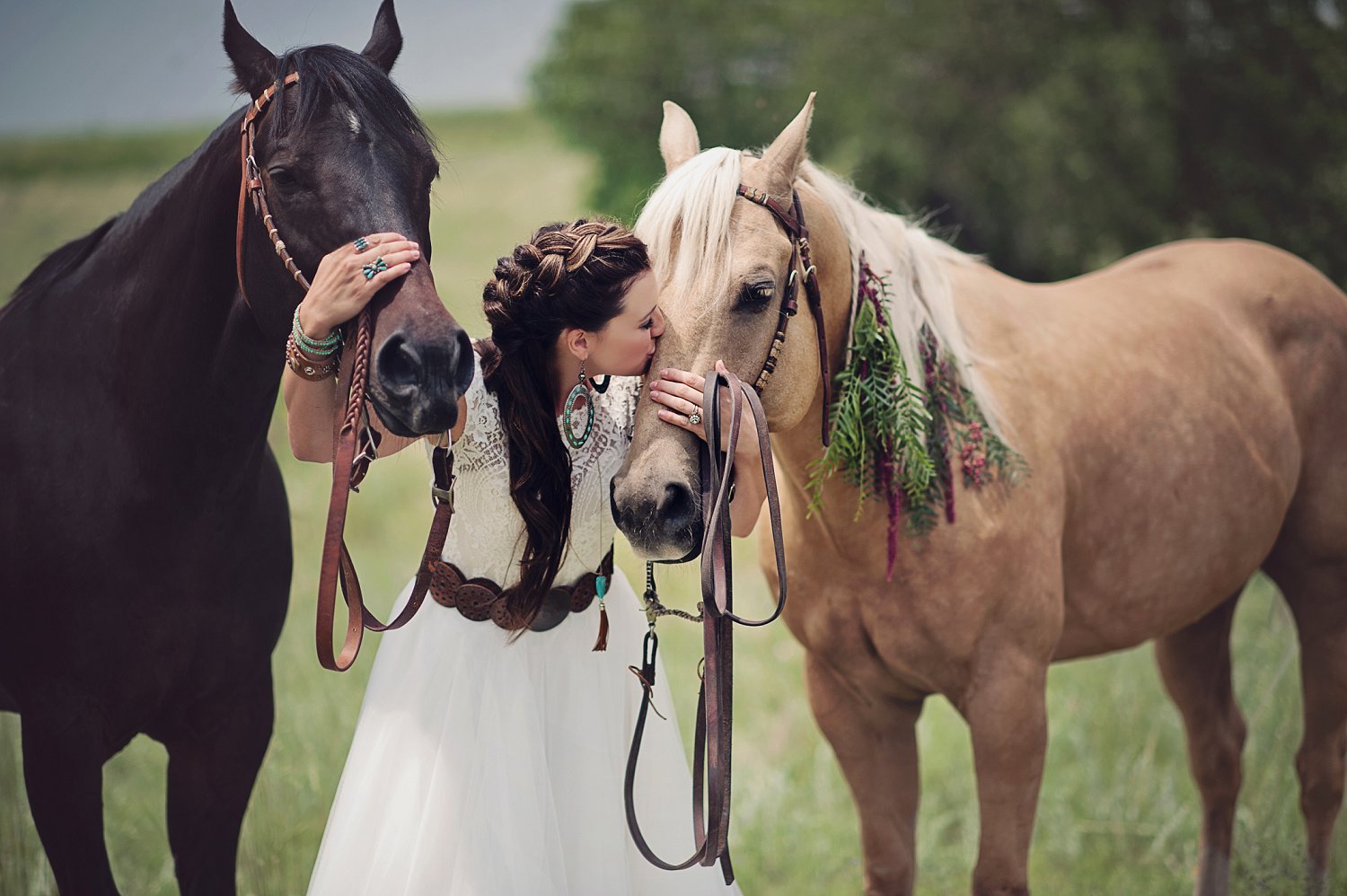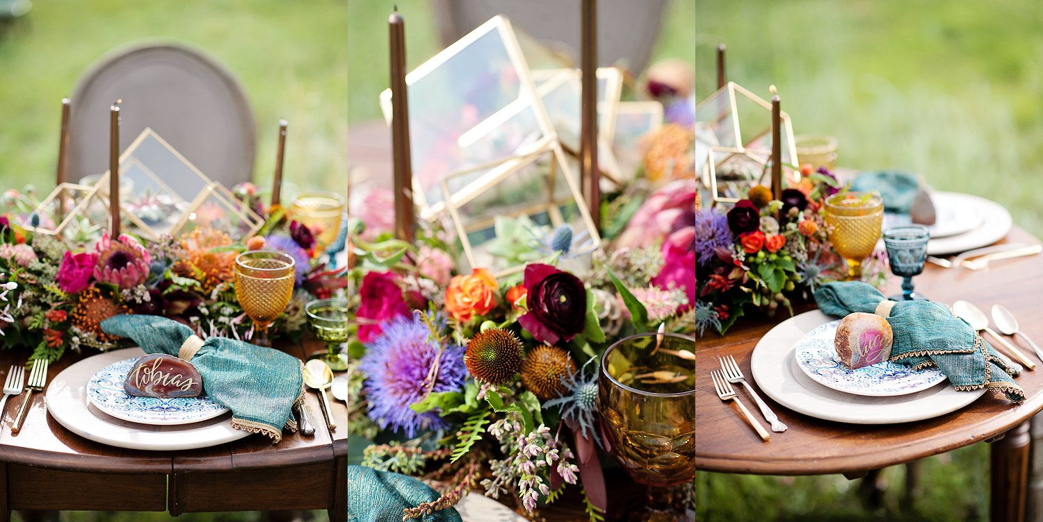 So from there, my super talented friend over at Sunflower Creative, helped with SO much of the table design, details and some of the boho (jewelery, boots, belts etc).  We spent a ton of time planning, dreaming and having FUN.  I think its easy in this industry to just keep working…photographing the beautiful weddings is SO amazing but sometimes a girl just has to get out there and shoot, style, create for her self.  And that is what we did!  From the amazing talent on the stones for calligraphy, to the feather detail on the cake and the gold and turquoise coloring…and not only that but I need to  mention the intricate braids  Beauty on Location by Liz worked on with April and the horse…yes, little braids on the horse.  Such beautiful work!
