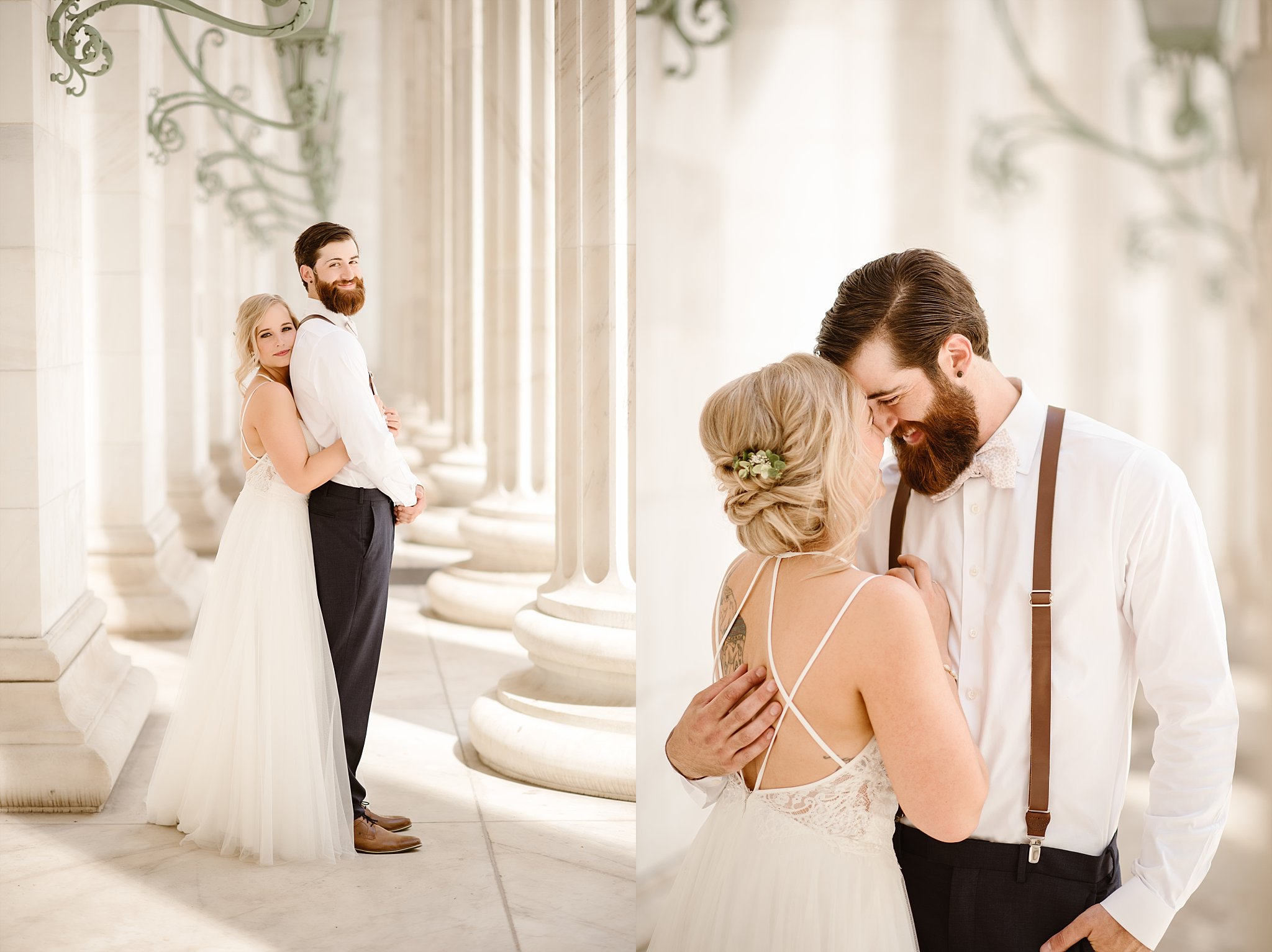 This wedding was a whole lot of wow. I’m pretty sure I had to stop myself several times through out the day and say I can’t believe I get to do this. That this is my job…gosh I love what I do. YES, the architecture at the Tivoli Station is absolutely amazing in Denver. From the antique white washed tin ceilings in the girls getting ready area…to the gorgeous high windows and the brushed exposed brick. In the guys area…which was also where the cocktail hour was, old worn in flooring, gorgeous brick, tall ceilings with all exposed wood work…just the detailing on this was impressive. It wasn’t made in the last few years to look old but has been here for a long time. I loved that. They had market lighting strung up and hung all across the main reception and ceremony area with candles twinkling all night. SO romantic and timeless. So YES, these things made me stop and say wow it was this couple that I adored working with. Gracious, kind, incredibly funny and they were SO in their moment. They took time through out the day to let each other know that this wedding this day was something they each treasured. And I loved seeing it. Jenn and Dom chose to have a first look at the Byron Courthouse in downtown Denver. OMG this place you guys…white washed everything and huge tall pillars with mint green lanterns…just a photographers dream to photograph. I loved the way the light danced along the leading lines everywhere. And can I say I’m so thankful Dom and Jenn had a first look. Not only did that mean more time together but it also meant that when it rained later on that day we had so many beautiful moments in that gorgeous sunshine before it hit. I seriously can’t recommend first looks enough on a wedding day. Time goes by SO fast and you think you have all the time in the world for everything…this helps slow it down a little. Who doesn’t want more time with their new hubby/wife? 🙂