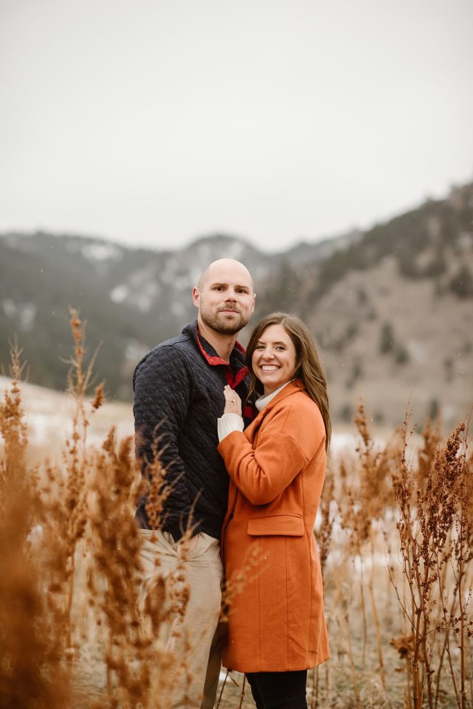 Anna and Jon flew in for a quick weekend to celebrated Thanksgiving with their family. And on the day of their engagement session a blizzard was expected to breeze on in right as we originally planned for their engagement photos at Chautauqua Park. They easily adapted to heading out right in the afternoon. I wouldn’t normally suggest this time but it ended up being the perfect overcast day and the mountains really made for a gorgeous back drop. Towards the end of their engagement session the snow just started to come down. I was SO happy that I didn’t have a 2 hour commute in a blizzard for the way home. Haha. And I loved that we were able to capture some of that gorgeous snow for them.